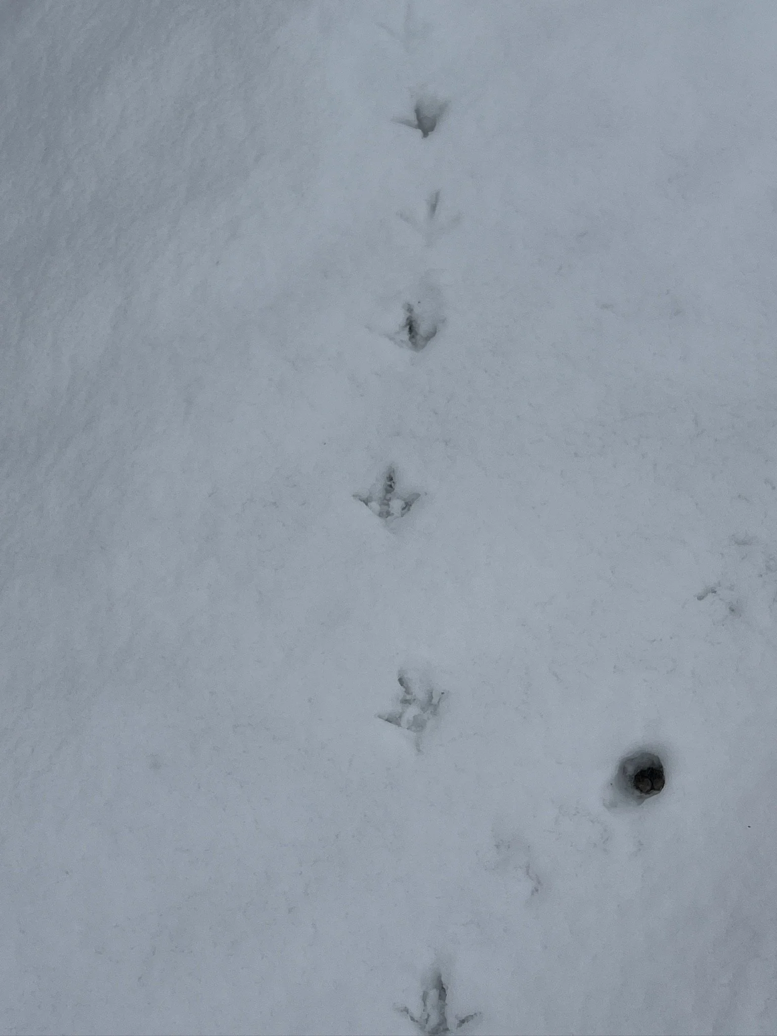 Day two in the mountains. Tracking again. For mammals, we identify them by looking at the distance between their three toes. The one we found today was pretty wide—most likely a tufted deer. Next to it were chicken tracks; chicken prints are easy to recognize. In the snow, most likely a blood pheasant. We saw them on our way to the top of the mountain too.